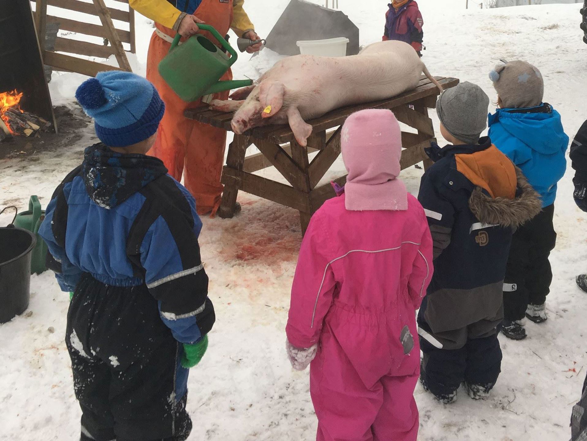 Slakteren kom så og avlivet grisen før barna fikk bli med å se på at den ble skåldet. Noen av barna var med og holdt i grisen og de mest ivrige prøvde å skålde selv. Barna fulgte også spent med når innmaten ble tatt ut og de studerte både lever, nyrer, hjerte, lunger og tarmer.